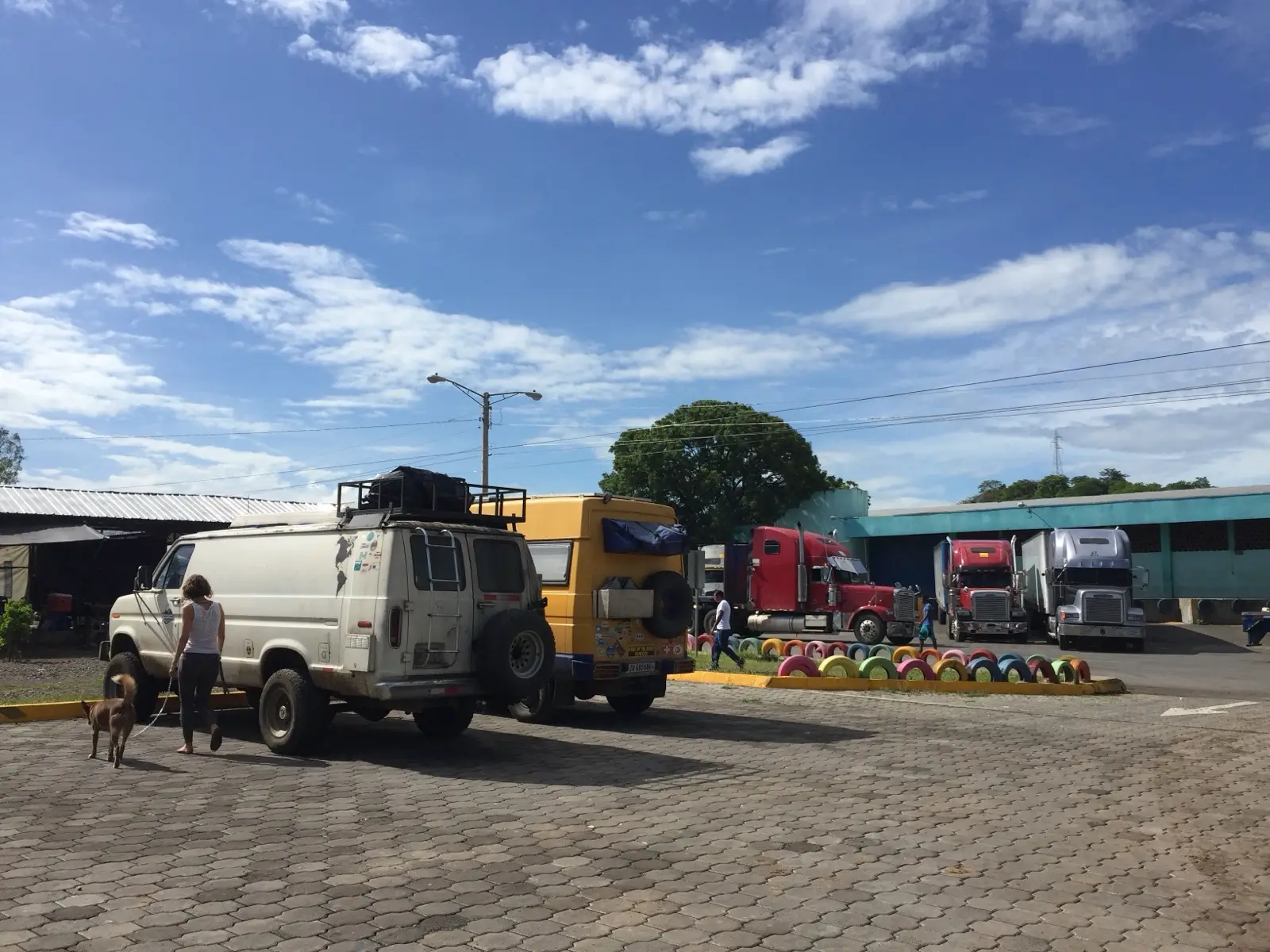 Die honduranische Seite dieser Grenze ist sehr heruntergekommen. Ein riesiger Kiesplatz mit Schlaglöchern so groß, dass ein Mittelklasse-PKW darin verschwinden könnte, befindet sich gegenüber dem Migrationsgebäude. Alles ist vollgestopft mit LKWs, sodass auch wir dort parken müssen. Schon bei der Einfahrt wurden wir von Grenzhelfern belagert, die uns beim Papierkram helfen wollen, und junge Burschen, die das vermutlich mal werden wollen, bieten uns an, auf unsere Autos aufzupassen – alles natürlich gegen Propina (Trinkgeld). Wir lehnen dankend ab, sagen, dass wir einen Hund haben, der aufpasst, und reihen uns in der langen Schlange vor den Beamtenhäuschen ein. Es geht schnell, eine junge Beamtin bearbeitet uns, und nach ca. 20 Minuten sind wir hier fertig.